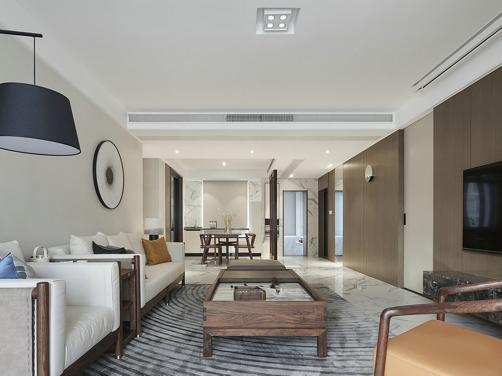 客廳選擇做大理石電視背景墻,再配上整面墻的木飾面板,起到點綴的效果。同時采用斯帕卡疊級,懸浮造型讓人把視線集中在電視區域,整體看起來更有檔次。