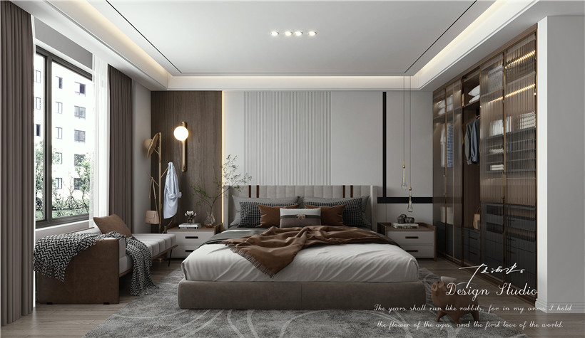 次臥墻面選用霧都綠色,搭配摩卡棕床頭,打造溫馨睡眠環境。衣柜和床體之間留出足夠的通行寬度,同時確保衣柜開門不受影響。